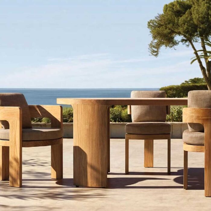 Set masă cu scaune din lemn de tec masiv, design sculptural, model Serena