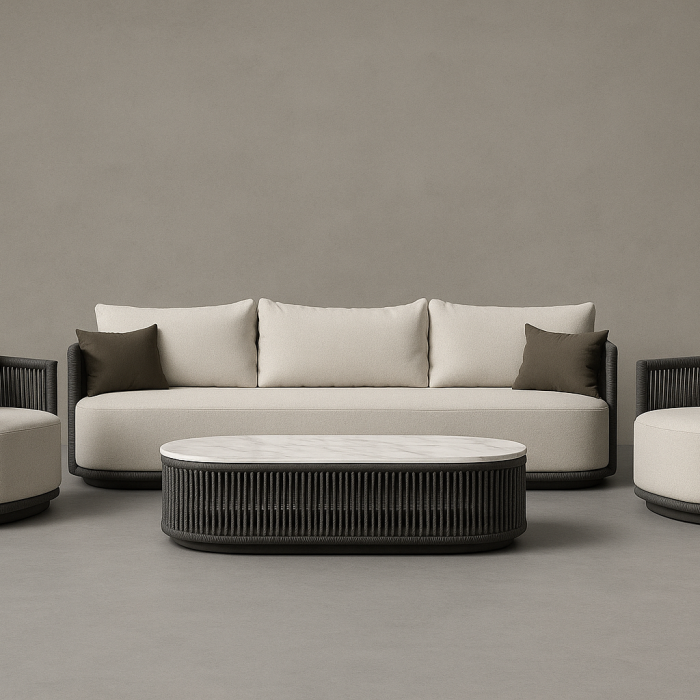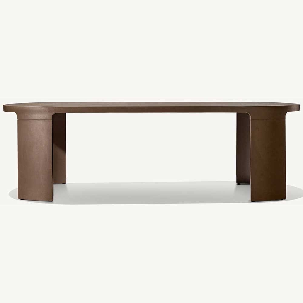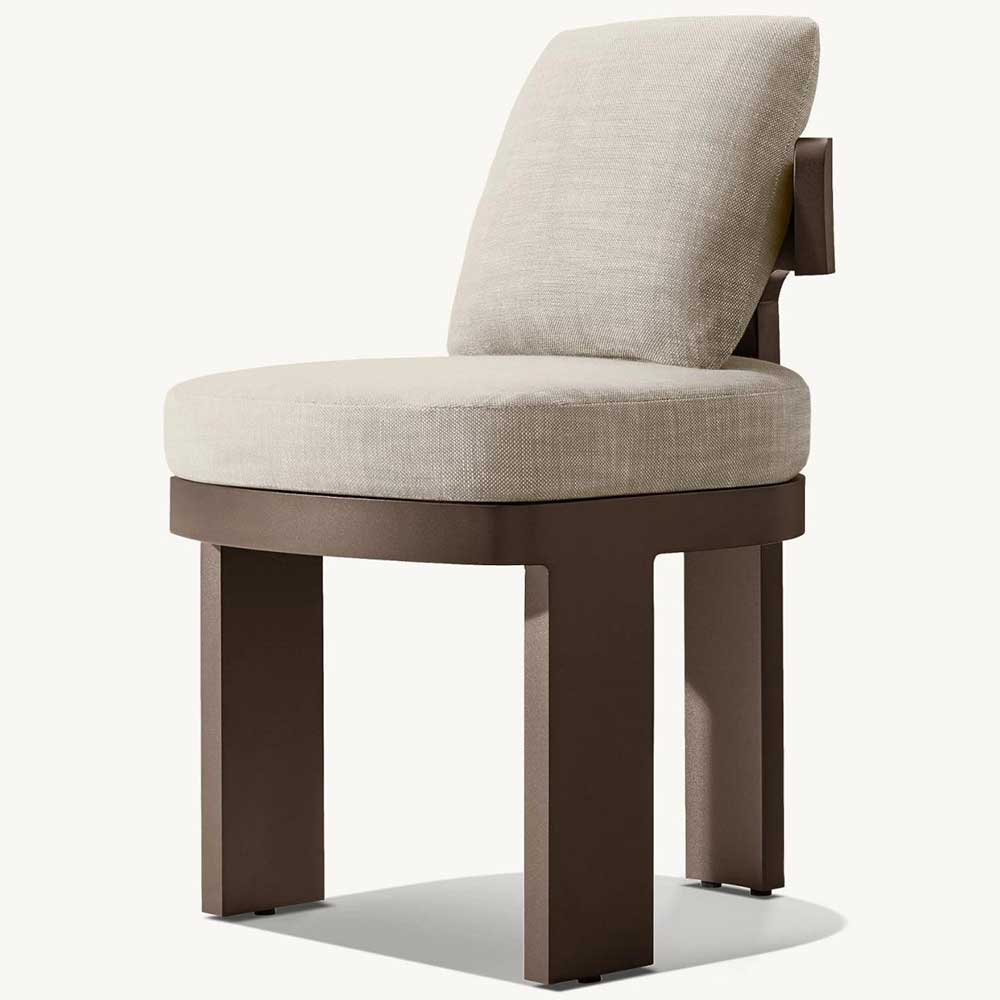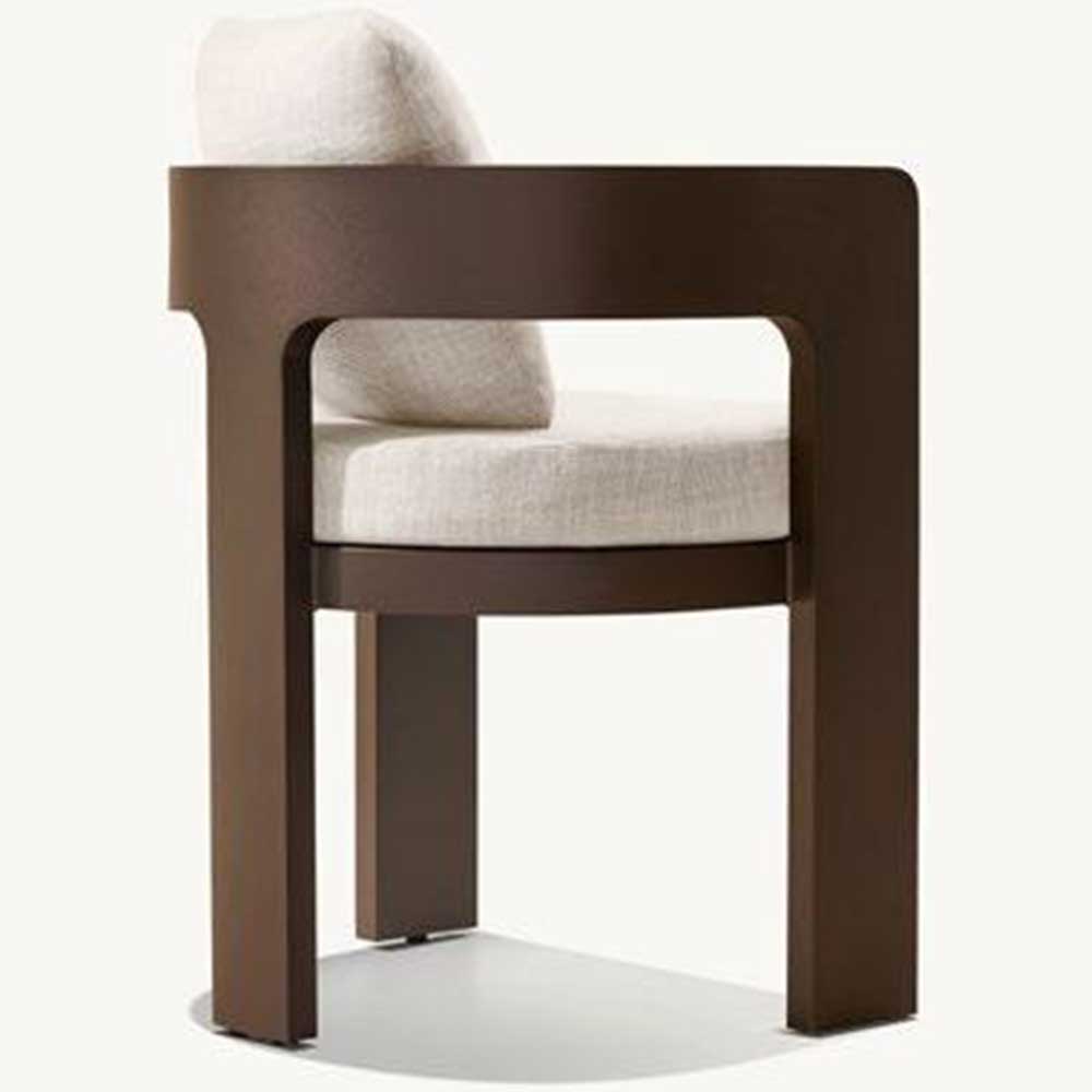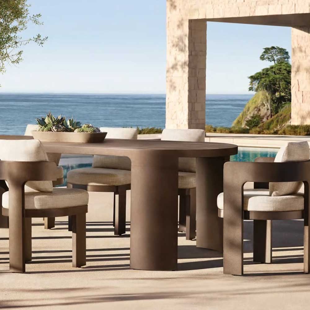 Serena Alto este versiunea modernă a setului de dining cu aceleași proporții sculpturale, dar realizată din aluminiu vopsit în câmp electrostatic. Finisajul bronz mat, formele fluide și tapițeria crem fac din acest set alegerea ideală pentru terase contemporane de lux.